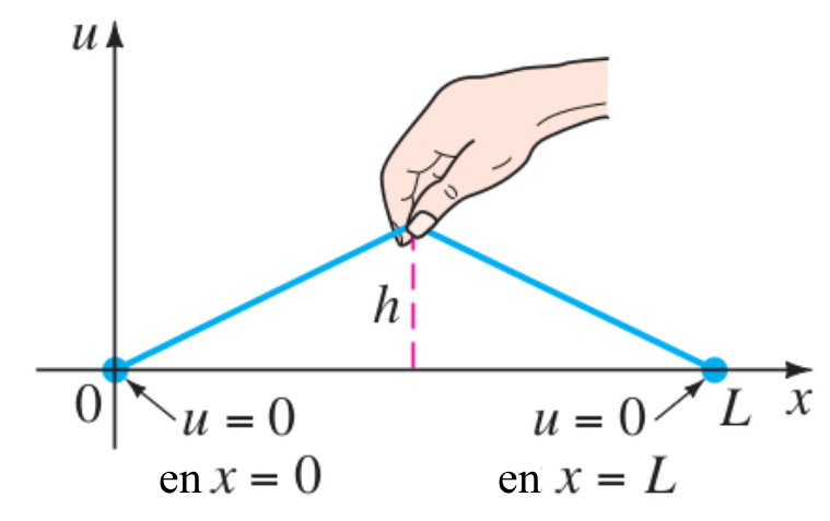 Por otro lado, para una cuerda vibrante podemos especificar tanto su desplazamiento inicial (o forma) \(f(x)\) como su velocidad inicial \(g(x)\). En términos matemáticos, buscamos una función \(u(x, t)\) que satisfaga 4.2 y las dos condiciones iniciales: \[ u(x, 0) = f(x), \quad \left. \frac{\partial u}{\partial t} \right|_{t=0} = g(x), \quad 0 < x < L. \tag{4.4}\]