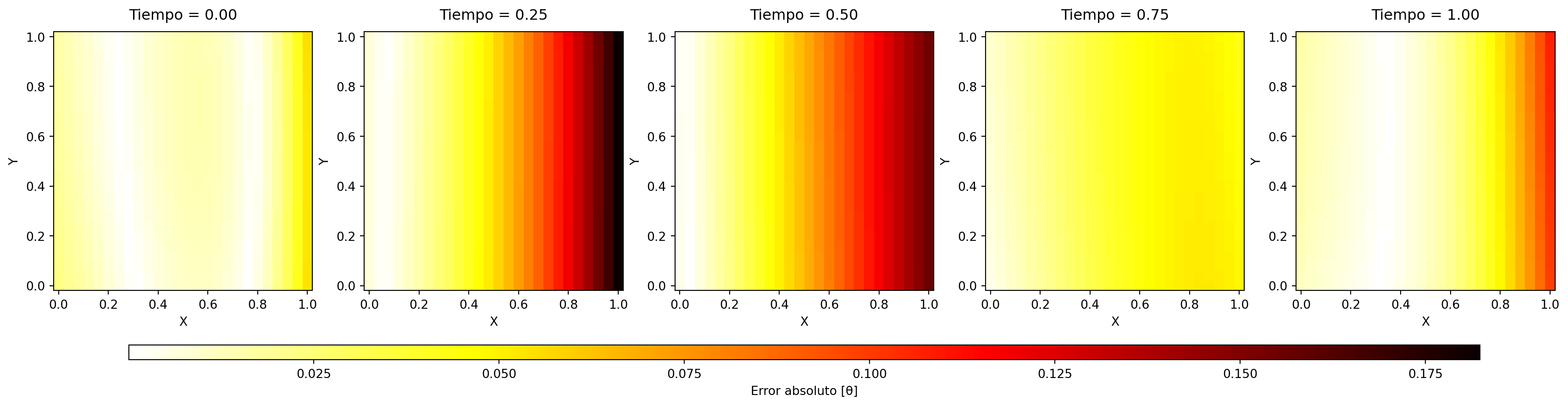 # Calcular el error absoluto entre los dos dataframeserror_data = model_don_data.copy()error_data['error'] = np.abs( sol_ana_data['Theta'] - model_don_data['Theta'])# Crear figura con 3 filas y 2 columnasfig, axes = plt.subplots(nrows=1, ncols=5, figsize=(22, 8))axes = axes.ravel() # Convertir a array 1D para fácil acceso# Asumir que el grid es regularnum_points =int(np.sqrt( error_data[error_data["time"] == times[0]].shape[0] ))# Configuración común para los mapas de calorplot_kwargs = {'cmap': 'hot_r','shading': 'auto','vmin': error_data['error'].min(),'vmax': error_data['error'].max()}# Lista para guardar los gráficosabs_errors_pc = []# Crear los subplotsfor i, t_val inenumerate(times): ax = axes[i]# Filtrar por tiempo actual df_t = error_data[error_data["time"] == t_val]# Obtener valores y reshape X_vals = df_t["X"].values.reshape((num_points, num_points)) Y_vals = df_t["Y"].values.reshape((num_points, num_points)) error_vals = df_t["error"].values.reshape((num_points, num_points))# Crear mapa de calor pc = ax.pcolormesh(X_vals, Y_vals, error_vals, **plot_kwargs)# Configuración de ejes ax.set_title(f"Tiempo = {t_val:.2f}", pad=10) ax.set_xlabel("X") ax.set_ylabel("Y") ax.set_aspect('equal') abs_errors_pc.append(pc)cbar = fig.colorbar(abs_errors_pc[-1], ax=axes, use_gridspec=True, shrink=0.9, aspect=90, pad=0.1, orientation='horizontal')cbar.set_label('Error absoluto [θ]')# Mostrar el gráficoplt.show()