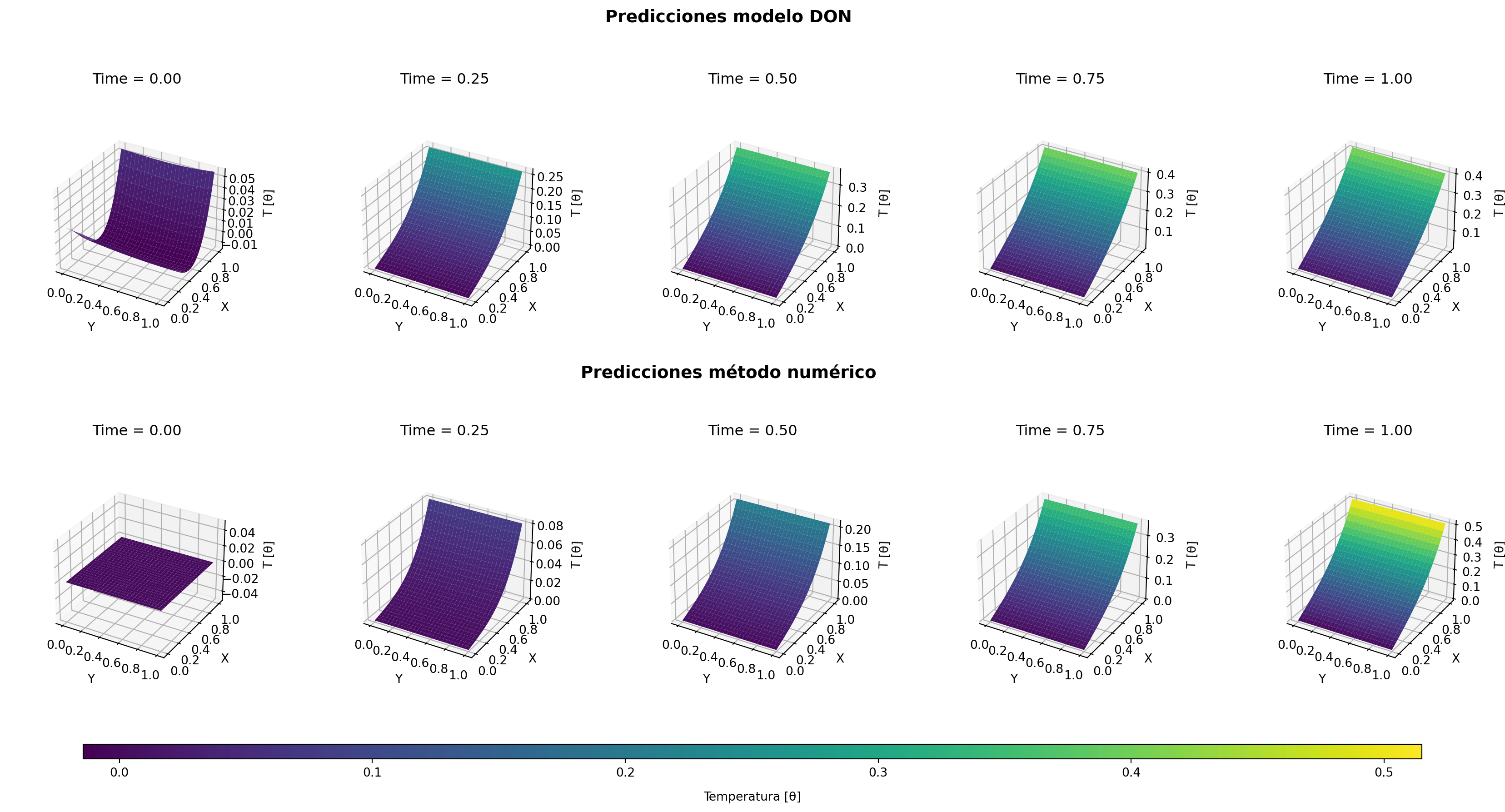 crank_nick_data = pd.read_csv(r'data/crank_nick.csv')model_don_data = pd.read_csv(r'data/model_DoN.csv')# Determinar los límites comunes para el colorbarmin_temp =min(model_don_data['Theta'].min(), crank_nick_data['Theta'].min())max_temp =max(model_don_data['Theta'].max(), crank_nick_data['Theta'].max())# Crear figura con subplots 3D en 2 filas y 5 columnasfig = plt.figure(figsize=(22, 12))axes = []# Crear los subplotsfor i inrange(2): # 2 filasfor j inrange(5): # 5 columnas axes.append(fig.add_subplot(2, 5, i*5+ j +1, projection='3d'))axes = np.array(axes).reshape(2, 5)# Añadir títulos generales para cada filafig.text(0.5, 0.92, "Predicciones modelo DON", ha='center', va='center', fontsize=14,fontweight='bold')fig.text(0.5, 0.58, "Predicciones método numérico", ha='center', va='center', fontsize=14, fontweight='bold')# Función para graficar un dataframe en una fila específicadef plot_dataframe(df, row, num_points, cmap="viridis"): surf_list = []for col, t_val inenumerate(times): ax = axes[row, col]# Filtrar por tiempo actual df_t = df[df["time"] == t_val]# Obtener los valores de X, Y, Theta X_vals = df_t["X"].values.reshape((num_points, num_points)) Y_vals = df_t["Y"].values.reshape((num_points, num_points)) Z_vals = df_t["Theta"].values.reshape((num_points, num_points))# Dibujar la superficie con límites comunes surf = ax.plot_surface( Y_vals, X_vals, Z_vals, rstride=1, cstride=1, cmap=cmap, edgecolor="none", antialiased=True, vmin=min_temp, vmax=max_temp ) surf_list.append(surf) ax.set_title(f"Time = {t_val:.2f}", pad=10) ax.set_xlabel("Y", labelpad=10) ax.set_ylabel("X", labelpad=10) ax.set_zlabel("T [θ]", labelpad=10, rotation=90) ax.set_box_aspect(None, zoom=0.75)return surf_list# Asumimos que el grid es regular para ambos dataframesnum_points =int(np.sqrt( model_don_data[model_don_data["time"] == times[0]].shape[0]))# Graficar el primer dataframe en la fila superiorsurf_model_don = plot_dataframe(model_don_data, 0, num_points)# Graficar el segundo dataframe en la fila inferiorsurf_crank_nick = plot_dataframe(crank_nick_data, 1, num_points)# Añadir barra de color común en la parte inferiorcbar = fig.colorbar(surf_crank_nick[-1], ax=axes.ravel().tolist(), use_gridspec=True, orientation='horizontal', pad=0.05, aspect=90, shrink=0.9)cbar.set_label('Temperatura [θ]', labelpad=10)plt.show()
