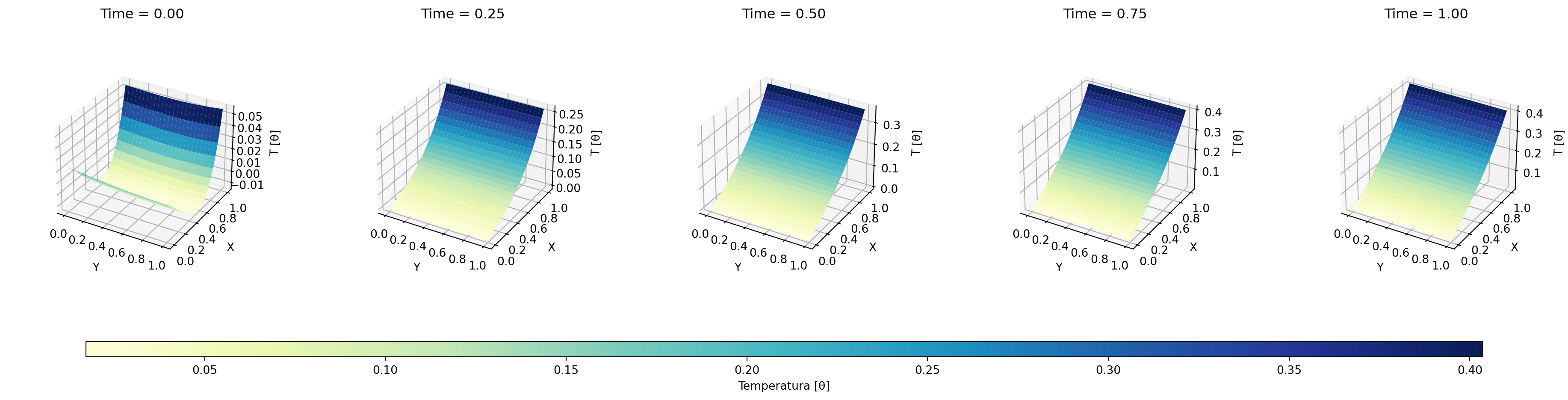 import matplotlib.pyplot as pltfrom mpl_toolkits.mplot3d import Axes3Dimport matplotlib.gridspec as gridspecimport pandas as pdimport numpy as np# Lista de tiempostimes = [0.0, 0.25, 0.5, 0.75, 1.0]# Cargar el dataframedf = pd.read_csv(r'data/model_DoN.csv') # Crear figura con subplots 3D en 1 fila y 5 columnasfig, axes = plt.subplots(nrows=1, ncols=len(times), figsize=(28, 7), subplot_kw={'projection': '3d'})plt.subplots_adjust(right=0.8)# Asumimos que el grid es regularnum_points =int(np.sqrt(df[df["time"] == times[0]].shape[0]))# Lista para almacenar los objetos surfacesurf_list = []# Reordenar para graficarfor i, (t_val, ax) inenumerate(zip(times, axes)):# Filtrar por tiempo actual df_t = df[df["time"] == t_val]# Obtener los valores de X, Y, Theta X_vals = df_t["X"].values.reshape((num_points, num_points)) Y_vals = df_t["Y"].values.reshape((num_points, num_points)) Z_vals = df_t["Theta"].values.reshape((num_points, num_points))# Dibujar la superficie surf = ax.plot_surface( Y_vals, X_vals, Z_vals, rstride=1, cstride=1, cmap="YlGnBu", edgecolor="none", antialiased=True ) surf_list.append(surf) ax.set_title(f"Time = {t_val:.2f}", pad=10) ax.set_xlabel("Y", labelpad=10) ax.set_ylabel("X", labelpad=10) ax.set_zlabel("T [θ]", labelpad=10, rotation=90) ax.set_box_aspect(None, zoom=0.75)# Añadir barra de color comúncbar = fig.colorbar(surf_list[-1], ax=axes, shrink=0.9, aspect=90, pad=0.1, orientation='horizontal')cbar.set_label('Temperatura [θ]')plt.show()