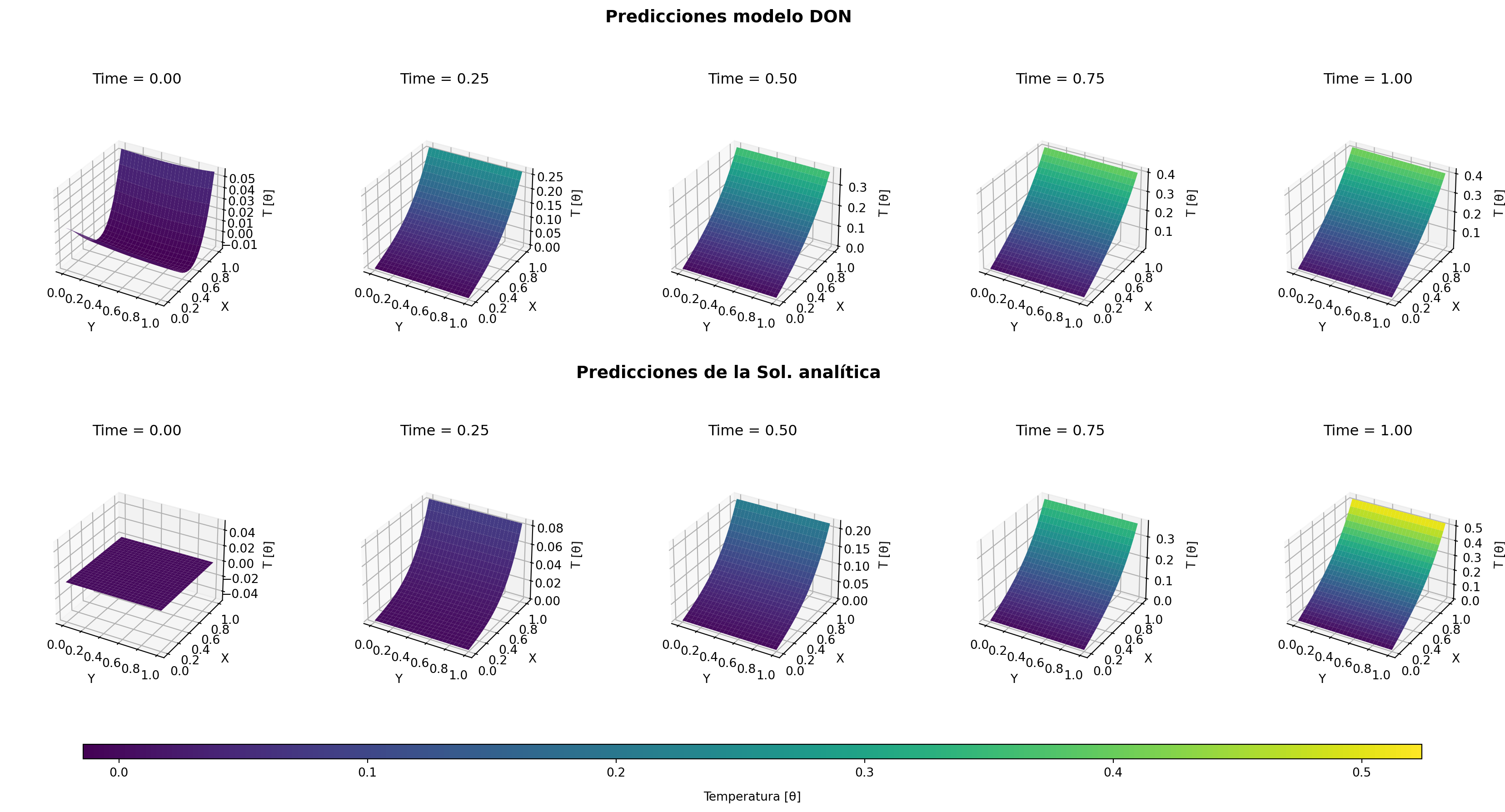 sol_ana_data = pd.read_csv(r'data/sol_analitica.csv')model_don_data = pd.read_csv(r'data/model_DoN.csv')# Determinar los límites comunes para el colorbarmin_temp =min(model_don_data['Theta'].min(), sol_ana_data['Theta'].min())max_temp =max(model_don_data['Theta'].max(), sol_ana_data['Theta'].max())# Crear figura con subplots 3D en 2 filas y 5 columnasfig = plt.figure(figsize=(22, 12))axes = []# Crear los subplotsfor i inrange(2): # 2 filasfor j inrange(5): # 5 columnas axes.append(fig.add_subplot(2, 5, i*5+ j +1, projection='3d'))axes = np.array(axes).reshape(2, 5)# Añadir títulos generales para cada filafig.text(0.5, 0.92, "Predicciones modelo DON", ha='center', va='center', fontsize=14,fontweight='bold')fig.text(0.5, 0.58, "Predicciones de la Sol. analítica", ha='center', va='center', fontsize=14, fontweight='bold')# Función para graficar un dataframe en una fila específicadef plot_dataframe(df, row, num_points, cmap="viridis"): surf_list = []for col, t_val inenumerate(times): ax = axes[row, col]# Filtrar por tiempo actual df_t = df[df["time"] == t_val]# Obtener los valores de X, Y, Theta X_vals = df_t["X"].values.reshape((num_points, num_points)) Y_vals = df_t["Y"].values.reshape((num_points, num_points)) Z_vals = df_t["Theta"].values.reshape((num_points, num_points))# Dibujar la superficie con límites comunes surf = ax.plot_surface( Y_vals, X_vals, Z_vals, rstride=1, cstride=1, cmap=cmap, edgecolor="none", antialiased=True, vmin=min_temp, vmax=max_temp ) surf_list.append(surf) ax.set_title(f"Time = {t_val:.2f}", pad=10) ax.set_xlabel("Y", labelpad=10) ax.set_ylabel("X", labelpad=10) ax.set_zlabel("T [θ]", labelpad=10, rotation=90) ax.set_box_aspect(None, zoom=0.75)return surf_list# Asumimos que el grid es regular para ambos dataframesnum_points =int(np.sqrt( model_don_data[model_don_data["time"] == times[0]].shape[0]))# Graficar el primer dataframe en la fila superiorsurf_model_don = plot_dataframe(model_don_data, 0, num_points)# Graficar el segundo dataframe en la fila inferiorsurf_crank_nick = plot_dataframe(sol_ana_data, 1, num_points)# Añadir barra de color común en la parte inferiorcbar = fig.colorbar(surf_crank_nick[-1], ax=axes.ravel().tolist(), use_gridspec=True, orientation='horizontal', pad=0.05, aspect=90, shrink=0.9)cbar.set_label('Temperatura [θ]', labelpad=10)plt.show()