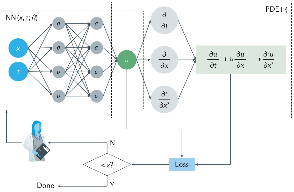 con una condición inicial adecuada y condiciones de contorno de Dirichlet. En la Figura 7.1, la red izquierda (physics-uninformed) representa el sustituto de la solución de EDP \(u(x, t)\), mientras que la red derecha (physics-informed) describe el residuo de EDP \(\frac{\partial u}{\partial t} + u \frac{\partial u}{\partial x} - \nu \frac{\partial^2 u}{\partial x^2} = 0\). La función de pérdida incluye una pérdida supervisada de las mediciones de datos de \(u\) de las condiciones iniciales y de contorno, y una pérdida no supervisada de EDP: