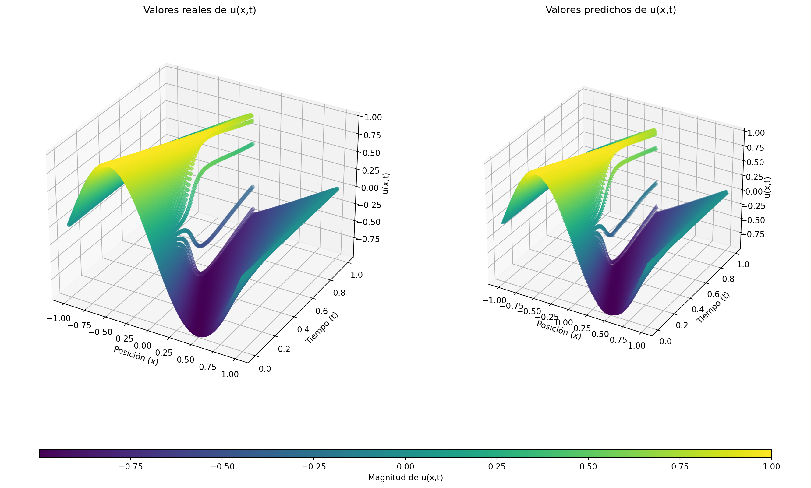 import matplotlib.pyplot as plt from mpl_toolkits.mplot3d import Axes3DX, y_true = gen_testdata()y_pred = model.predict(X)f = model.predict(X, operator=pde)# Extraer componentes de Xx_coords = X[:, 0] # coordenadas x (espacio)time = X[:, 1] # coordenadas t (tiempo)# Crear figura con dos subgráficos 3Dfig = plt.figure(figsize=(14, 8), constrained_layout=True)ax1 = fig.add_subplot(121, projection='3d')ax2 = fig.add_subplot(122, projection='3d')# Calcular límites comunes para los ejes zz_min =min(y_true.min(), y_pred.min())z_max =max(y_true.max(), y_pred.max())# Gráfico 1: Valores realessc1 = ax1.scatter(x_coords, time, y_true, c=y_true, cmap='viridis', marker='o', vmin=z_min, vmax=z_max)ax1.set_xlabel('Posición (x)')ax1.set_ylabel('Tiempo (t)')ax1.set_zlabel('u(x,t)')ax1.set_title('Valores reales de u(x,t)')ax1.set_zlim([z_min, z_max])ax1.set_box_aspect(None, zoom=0.9)# Gráfico 2: Valores predichossc2 = ax2.scatter(x_coords, time, y_pred, c=y_pred, cmap='viridis', marker='^', vmin=z_min, vmax=z_max)ax2.set_xlabel('Posición (x)')ax2.set_ylabel('Tiempo (t)')ax2.set_zlabel('u(x,t)')ax2.set_title('Valores predichos de u(x,t)')ax2.set_zlim([z_min, z_max])ax2.set_box_aspect(None, zoom=0.75)cbar = fig.colorbar(sc1, ax=(ax1,ax2), shrink=0.9, aspect=90, pad=0.1, orientation='horizontal')cbar.set_label('Magnitud de u(x,t)')plt.show()print("Error relativo L2:", dde.metrics.l2_relative_error(y_true, y_pred))